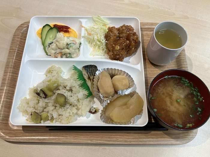 さつまいもごはんに、サバの塩焼き、甘酢からあげに、影の主役ポテトサラダ!