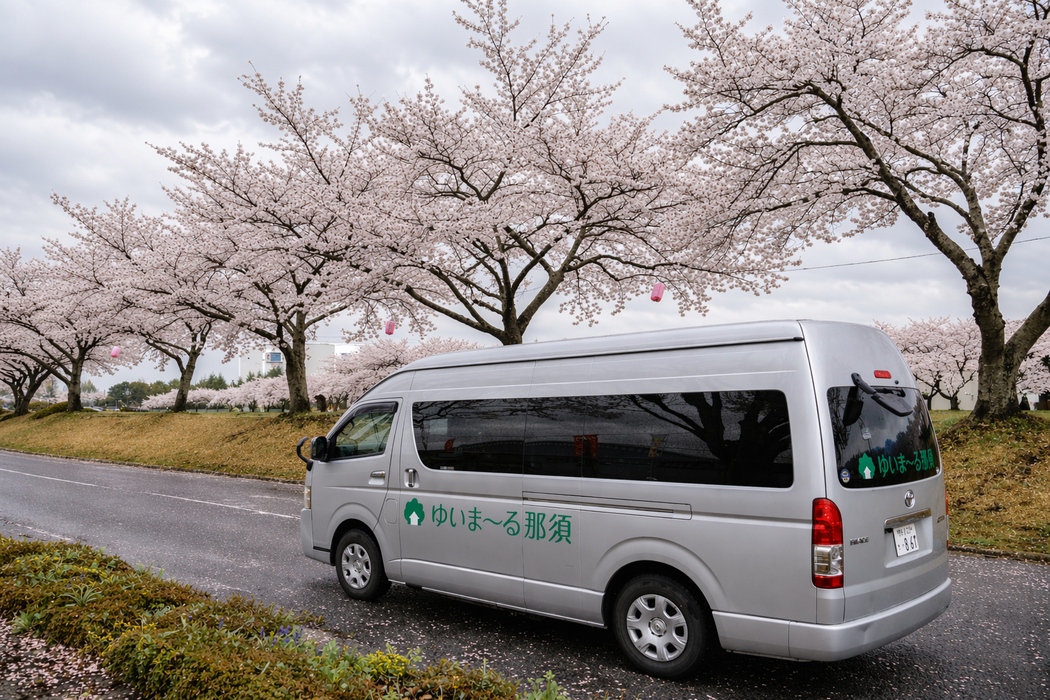 目的地3 太陽の国 参加者からのリクエストで 社会福祉施設「太陽の国」へ。施設周辺では約700本のソメイヨシノの桜のトンネルが出迎えてくれました。