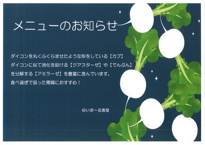 体に優しく美味しい食事で日々の笑顔と健康作りを応援します!! 食べることで幸せを感じ心が豊かになる地域の食卓ゆいま~る食堂