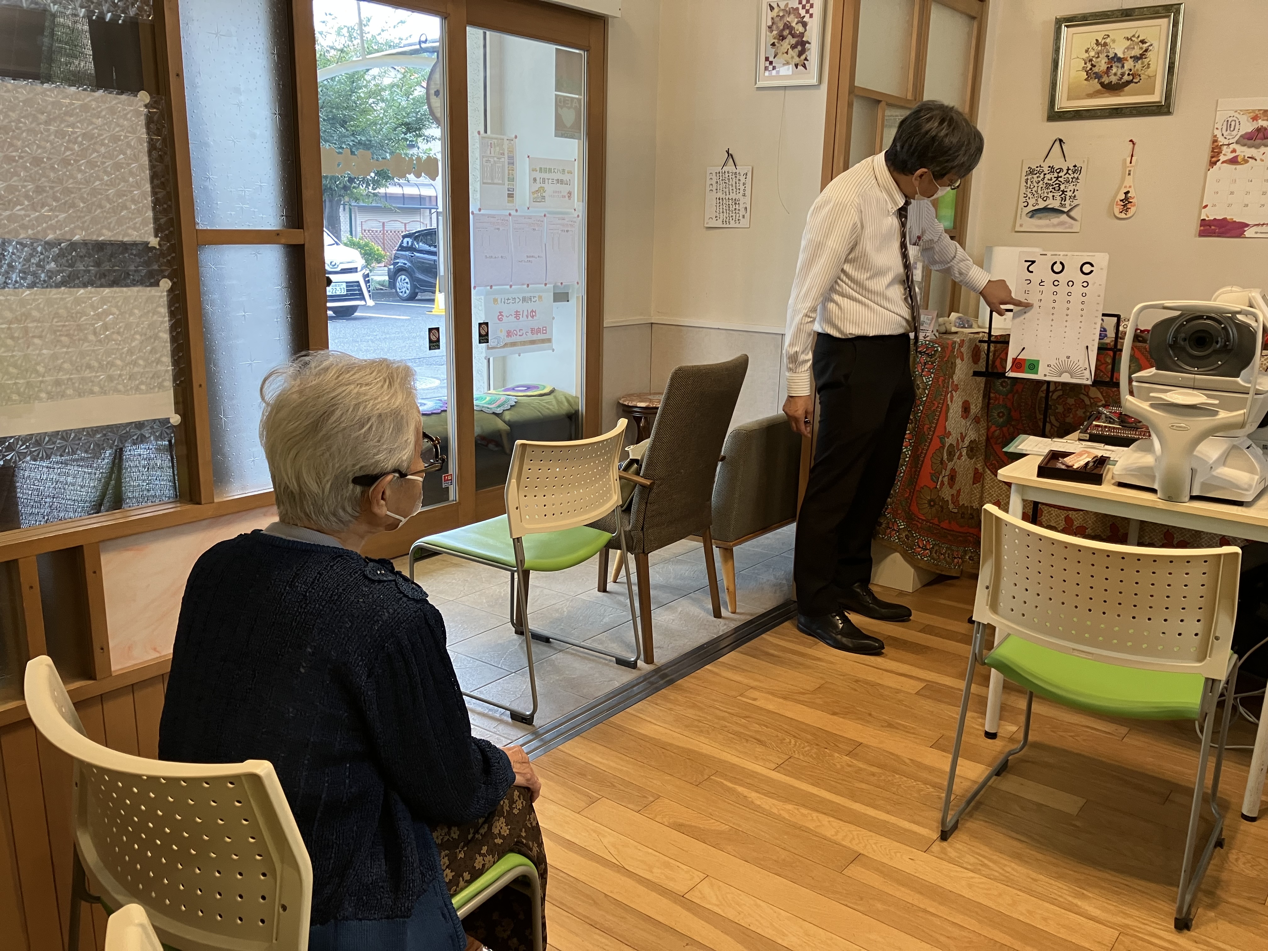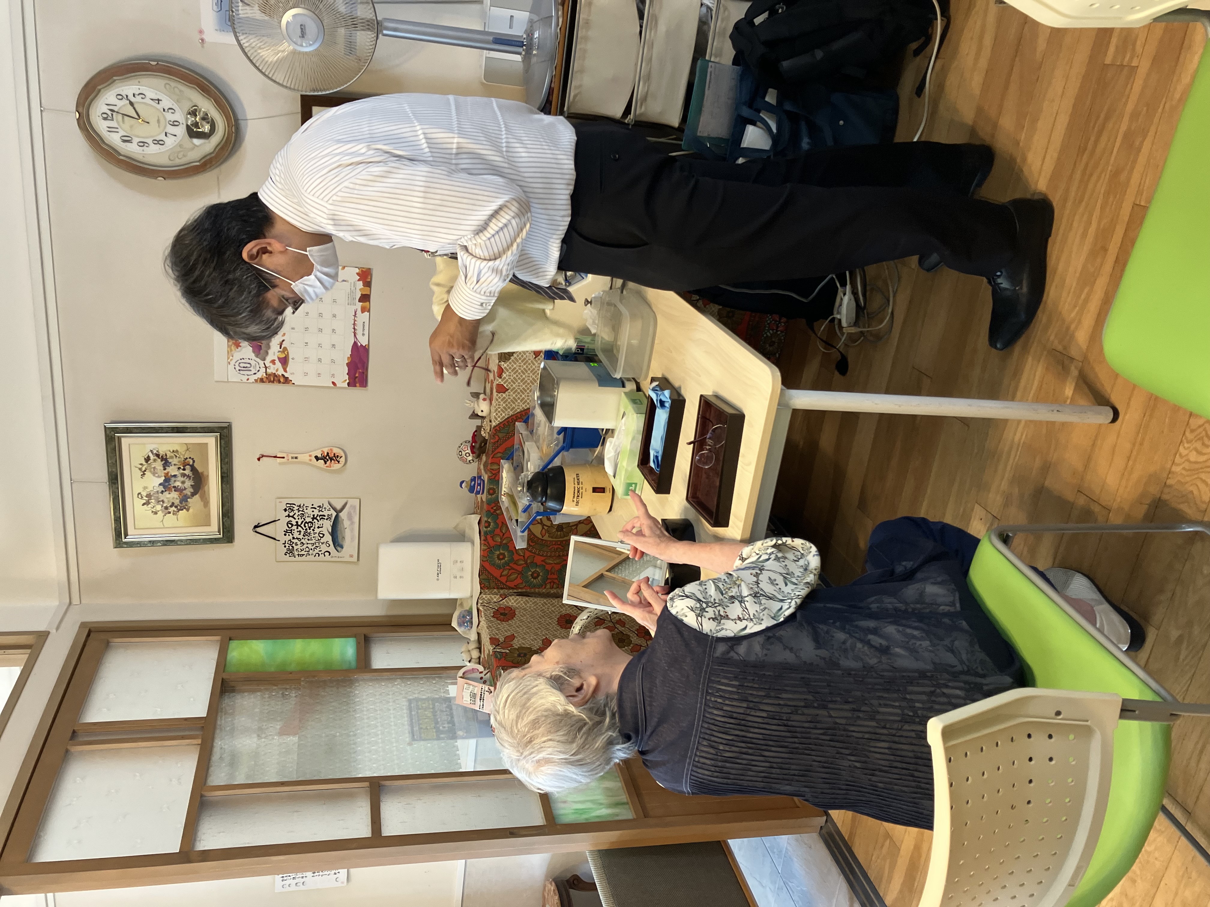 さて、今日は2か月に一度の『キクチメガネ』さんが来訪して下さる日でした。入居者の方は,メガネの洗浄やねじ締め・補聴器の音量調整などにお越し頂いています。