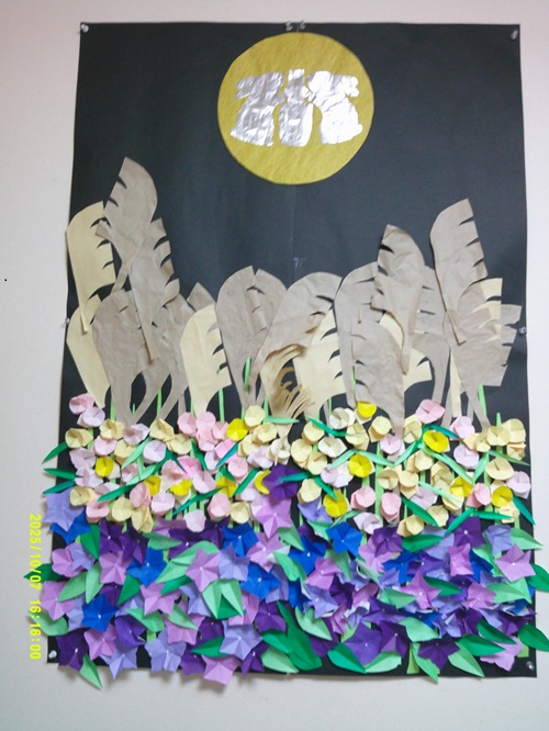 夜空のお月様の代わりに、フロアには大きな月とススキの作品が飾ってあります。ご利用者皆さんと一緒に完成した作品です(^^)/
