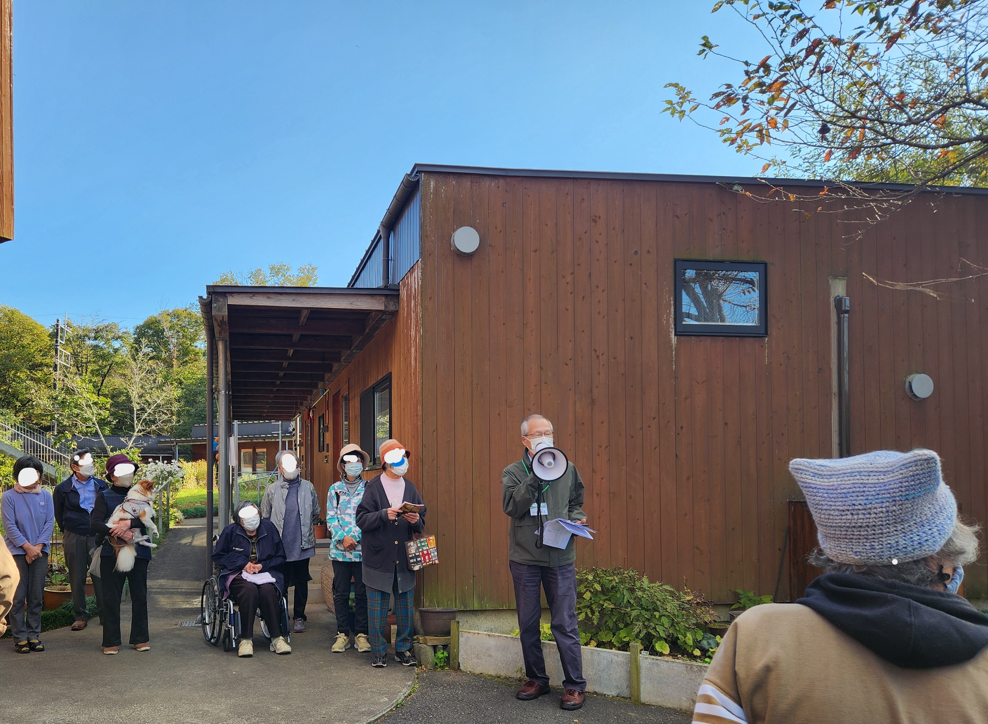 今回は深夜の食堂から出火を想定しての訓練となりました。スタッフが居ない想定の訓練でしたので、各棟の避難誘導係の方々が中心となり避難の声掛けを行い集合場所の音楽室前へ移動しました。