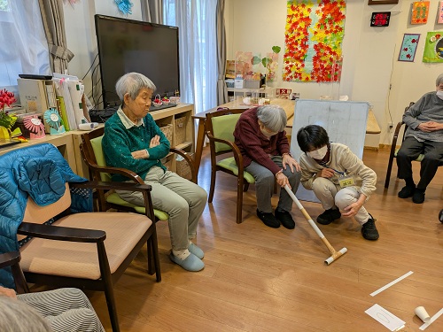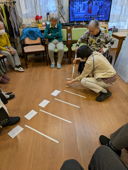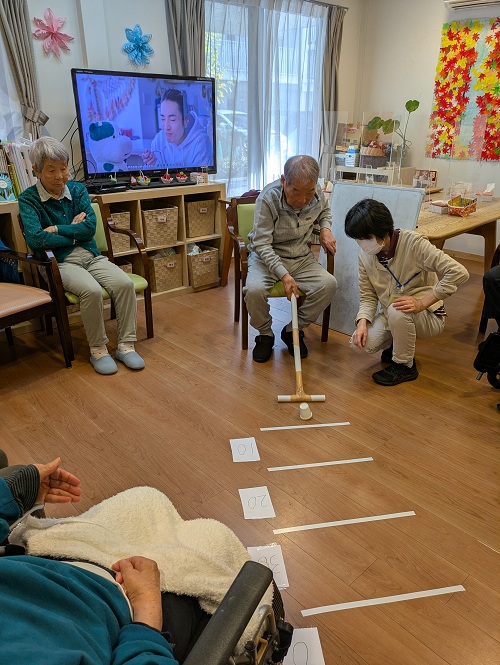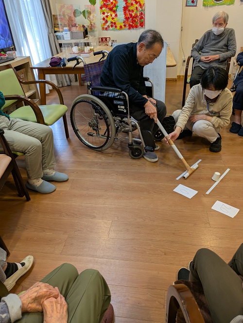 紙コップがスーっと滑り、点数が入った時は、拍手と歓声が響きます。紙コップが滑らず、途中で倒れた時も、「あーっ!」という声とともに、やはり歓声が響きます。ご利用者皆さんの笑い顔。楽しいひと時でした。