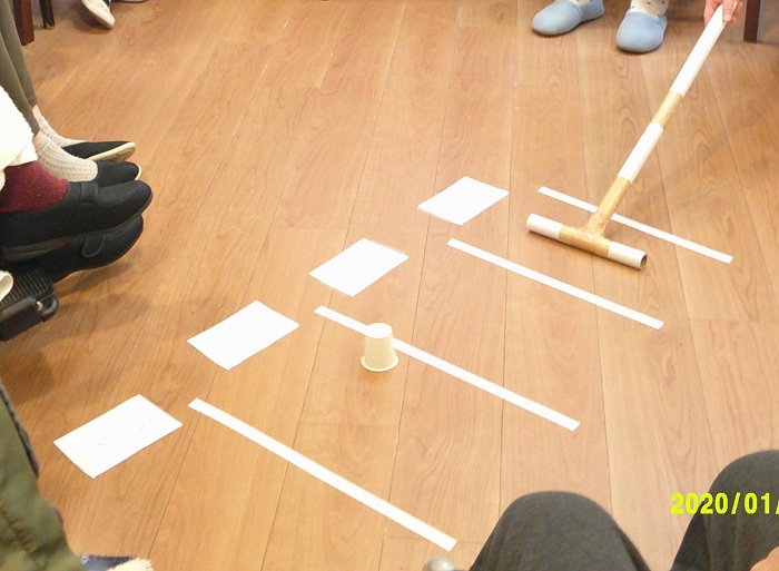 ぐり~んカーリングは、T字型の杖(カーリングブラシ)を使い、紙コップ(ストーン)を前方に滑らせます。滑らせた紙コップが止まった所が得点です(^^♪