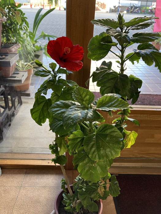 この季節に真っ赤なハイビスカスがフロントに咲いておりました。