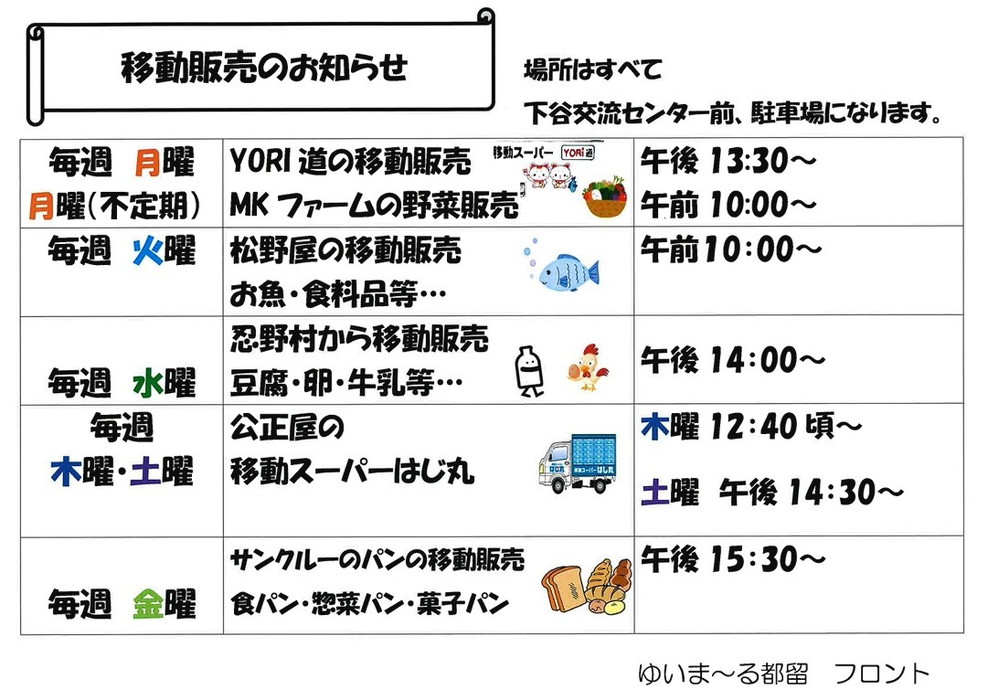 ゆいま~る都留での移動販売は日曜日以外、すべての曜日に来てくれるようになり、より買い物が便利になりました。