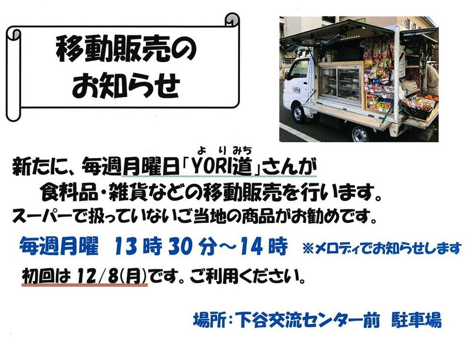 12/8から新たに移動販売「YORI道」さんが毎週月曜日13時30分から交流センター前に来てくれる事になりました。