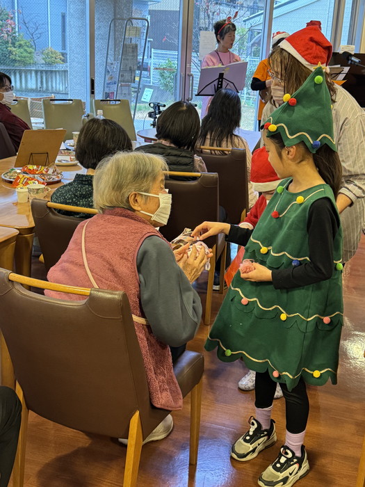 また、子供達が居住者にプレゼントを用意してくださり、1人ひとり心をこめて手渡しして下さいました。居住者からは「ありがとう」「かわいいね」と自然と笑顔が広がる温かな場面となりました。