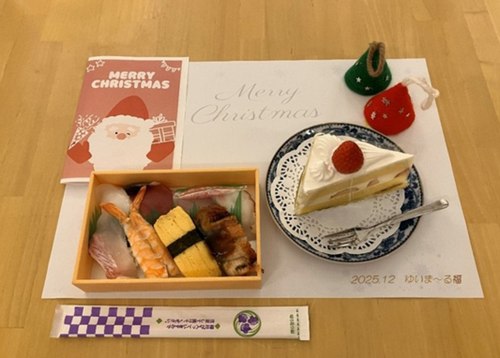 ショートケーキ右上の可愛いサンタハットを模した装飾品はゆいま~る福の向いある福小学校6年生の生徒さん、先生方が前日、ご訪問いただき、