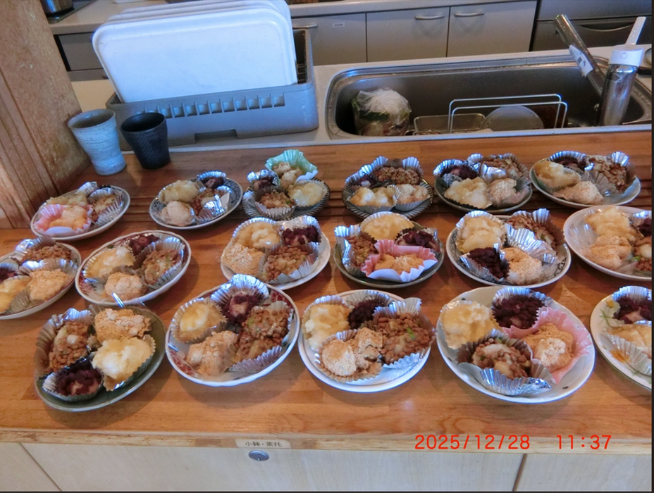 きなこ、あんこ、納豆、大根おろしと4種類のお餅が出来上がり、新年をお迎えする準備も整いました。