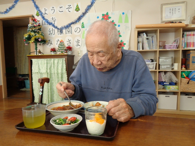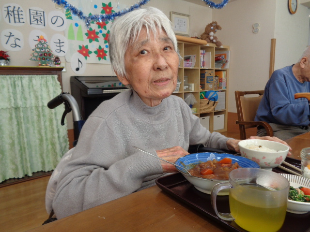 赤色、青色のクリスマスカラーになり、季節の雰囲気を味わって頂きました。ビーフシチューの牛肉が少し固かったのが残念ですが