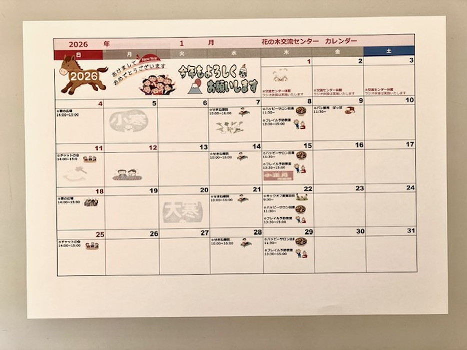 「ゆいま~る花の木」および「秩父市花の木交流センター」では居住者および地域の方向けに、2026年1月に以下のカレンダーのとおり、活動・催事を予定しています。
