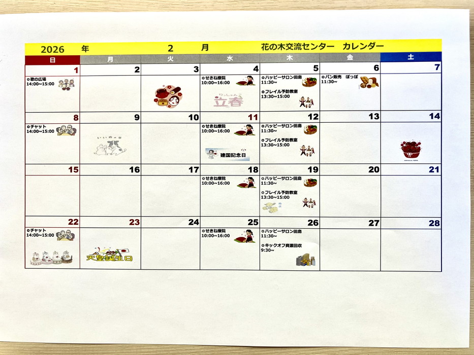 「ゆいま~る花の木」および「秩父市花の木交流センター」では居住者および地域の方向けに、2026年2月に以下のカレンダーのとおり、活動・催事を予定しています。