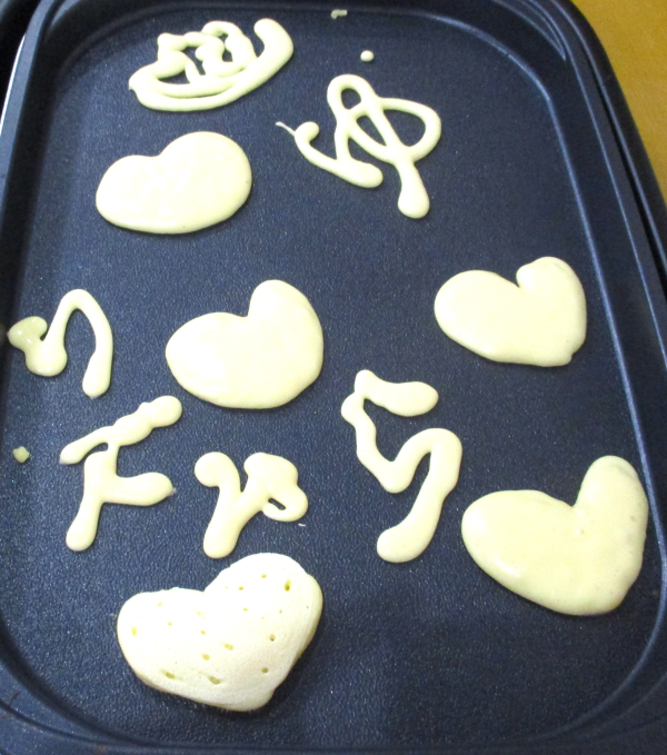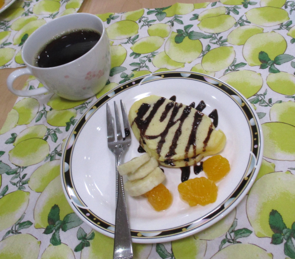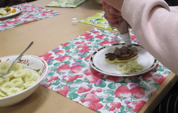 今日は、皆さんと一緒にホットケーキを焼いてトッピングをして、おやつにしました。