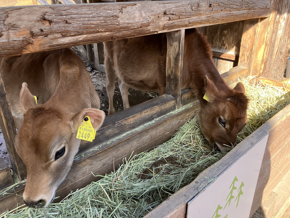 お隣の森林ノ牧場さんでは、ジャージー牛の子牛の りんちゃん、ちえちゃんがご飯を食べていました。すくすくと成長するのが楽しみですね。