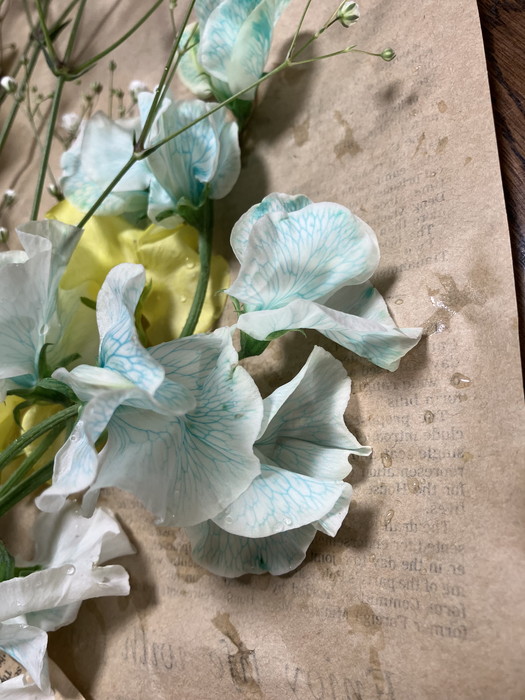 水色と黄色の「スイートピー」とオレンジ色の「チューリップ」