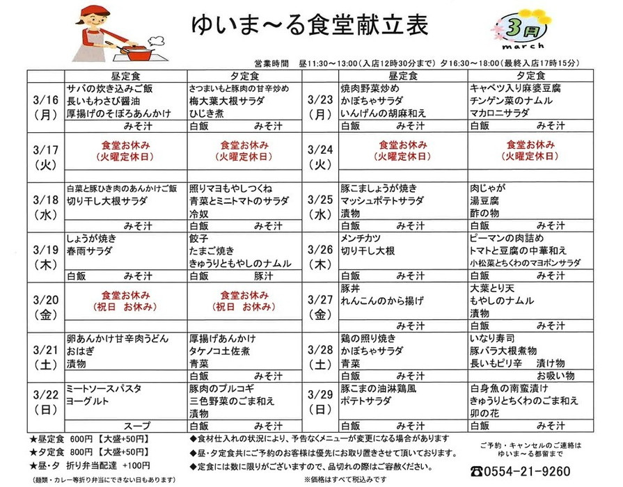 3/16~3/29の食堂献立表です。